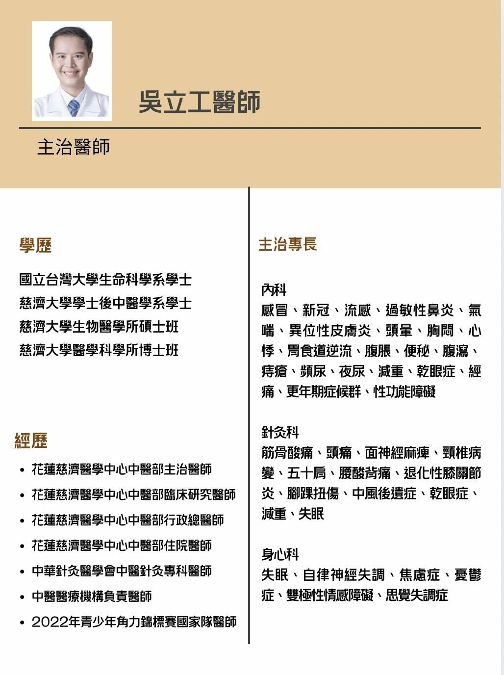 專科上,立工醫師特別對「身心科」疾病深入研究,包含失眠、自律神經失調、焦慮、憂鬱、雙極性情感障礙、思覺失調症…等疾病的中西合療,在花蓮慈濟醫院時還在身心科門診區開立身心科中西合療特別門診,照顧著身心失調的病友們。
